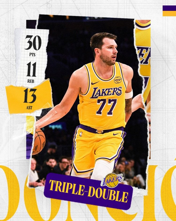 赛后,湖人官方晒出东契奇的数据海报,配文写道:“三双,外加绝杀!东契奇,今晚属于你!🌟”